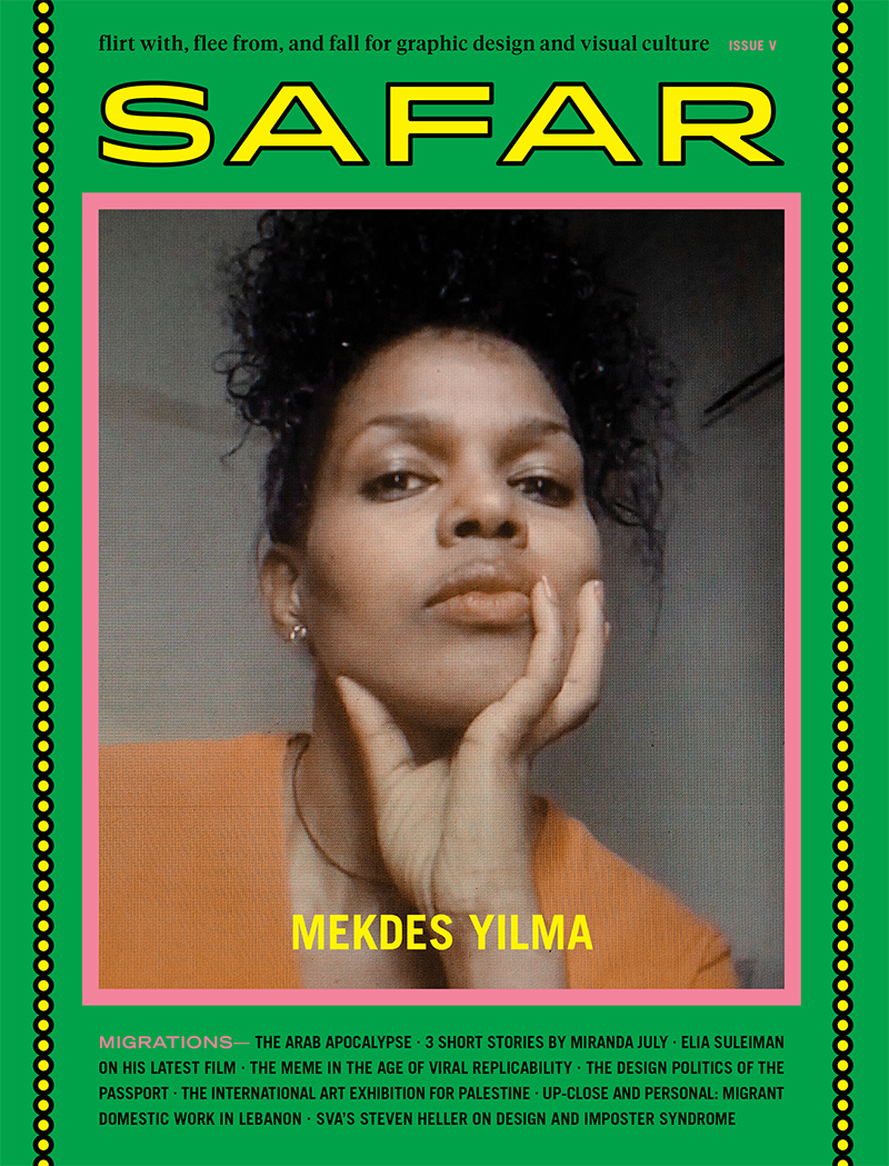 In the fifth issue, Migrations, Mekdes Yilma and Tsigereda Brihanu discuss the realities, challenges, and dangers faced by migrant domestic workers in Lebanon and their work to end an oppressive system; Miranda July shares three short stories from her collection No One Belongs Here More than You; Elia Suleiman talks about identification with globalized Palestine and his latest film, It Must be Heaven; Mazen Kerbaj illustrates his daily attempts to learn German; Steven Heller discusses how to shift the design history discourse and his experiences with Impostor syndrome; and more.